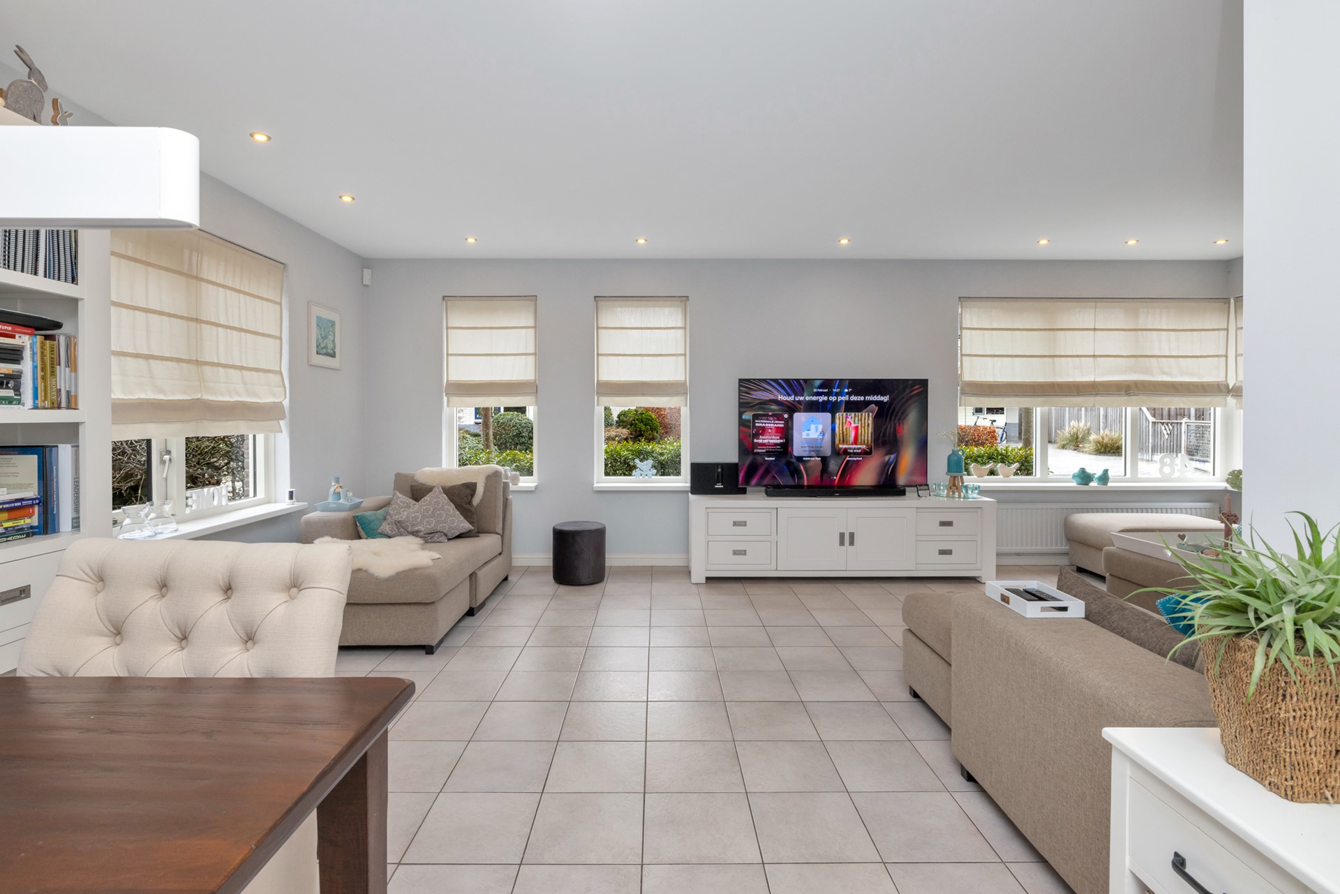 Met uitzicht op het groen rondom de woning én via de dubbele tuindeuren in directe verbinding met de tuin, is dit een ruimte waar binnen en buiten op zonnige dagen moeiteloos in elkaar overlopen.